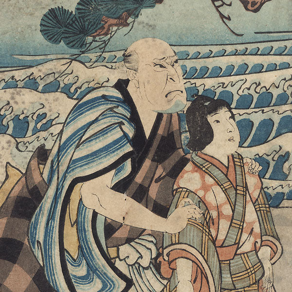Special detail - From right, the actors are Nakayama Nanshi II as Jiro's wife Oyoshi, Kataoka Ichizo I as Gonshiro, and Mimasu Jakusaburo I as Komawakamaru in Act 6 of Hirgana Seisuiki at the Naka Theater.
