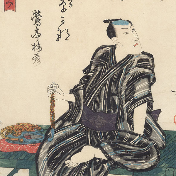 Comments - Handsome scene of three kabuki actors enjoying the evening cool. At left, Ichikawa Danjuro VIII relaxes on a bench with a pipe in hand, one geta clog kicked off with his leg pulled up. In the center, Bando Shuka I smiles back at him, a folding fan in hand. Her red under robe is visible beneath her sheer kimono. At right, Matsumoto Kinsho I scowls as he watches the beauty, a folding fan in hand and a blue cloth draped over his shoulder. Nice expressive figures, with soft shading in the background.