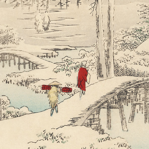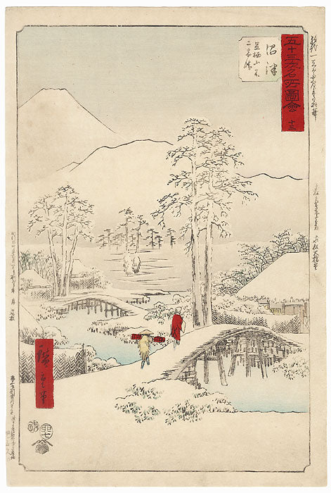 Pictures of Famous Places on the Fifty-three Stations (Vertical Tokaido) - Hiroshige's fantastic vertical Tokaido series was done in 1855 and represents a further evolution of his landscape design style, including some of his most modern designs. One of the striking features of this beautiful series was the vertical format, since the more common format for the landscape print was the horizontal. This unique approach allowed Hiroshige to experiment with the foreground and background contrasts that are typical of his work and seen in some of his other vertical landscape series. The concept for the vertical Tokaido grew out of the incredible popularity of the Great Tokaido (his first Tokaido series). Hiroshige wanted to expand on the theme, as the public was very interested in his fascinating images of life and travels along the most important thoroughfare in Japan- the road from Edo to Kyoto. From the urban center of Edo, where the journey began, to the beautiful rural landscape of the provinces more far away, the series is a set of handsome illustrations of Edo period Japan. This print is from the 1891 Memorial Edition of the series.