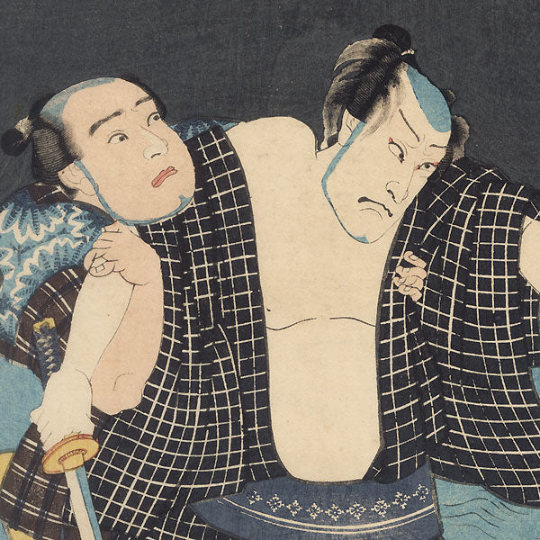Comments - Dramatic kabuki scene of a boatman trying to restrain a commoner brandishing a sword. The boatman grabs him from behind, pulling him off balance, an alarmed expression on his face as the commoner scowls angrily. The commoner's kimono hangs open at the chest, and his hair is disheveled. Undulating waves can be seen behind the grassy embankment beneath the night sky. Nice expressive figures in a handsome natural setting. Detailed with embossing on the white loincloth.