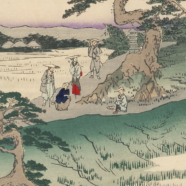 Pictures of Famous Places on the Fifty-three Stations (Vertical Tokaido) - Hiroshige's fantastic vertical Tokaido series was done in 1855 and represents a further evolution of his landscape design style, including some of his most modern designs. One of the striking features of this beautiful series was the vertical format, since the more common format for the landscape print was the horizontal. This unique approach allowed Hiroshige to experiment with the foreground and background contrasts that are typical of his work and seen in some of his other vertical landscape series. The concept for the vertical Tokaido grew out of the incredible popularity of the Great Tokaido (his first Tokaido series). Hiroshige wanted to expand on the theme, as the public was very interested in his fascinating images of life and travels along the most important thoroughfare in Japan- the road from Edo to Kyoto. From the urban center of Edo, where the journey began, to the beautiful rural landscape of the provinces more far away, the series is a set of handsome illustrations of Edo period Japan. This print is from the 1891 Memorial Edition of the series.